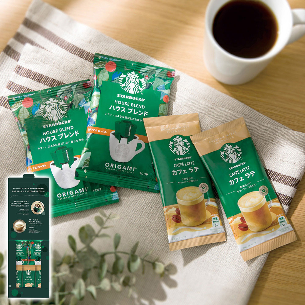 ■規格:スターバックス(オリガミパーソナルドリップコーヒーハウスブレンド9g×2袋・プレミアムミックスカフェラテ18g×3袋)
