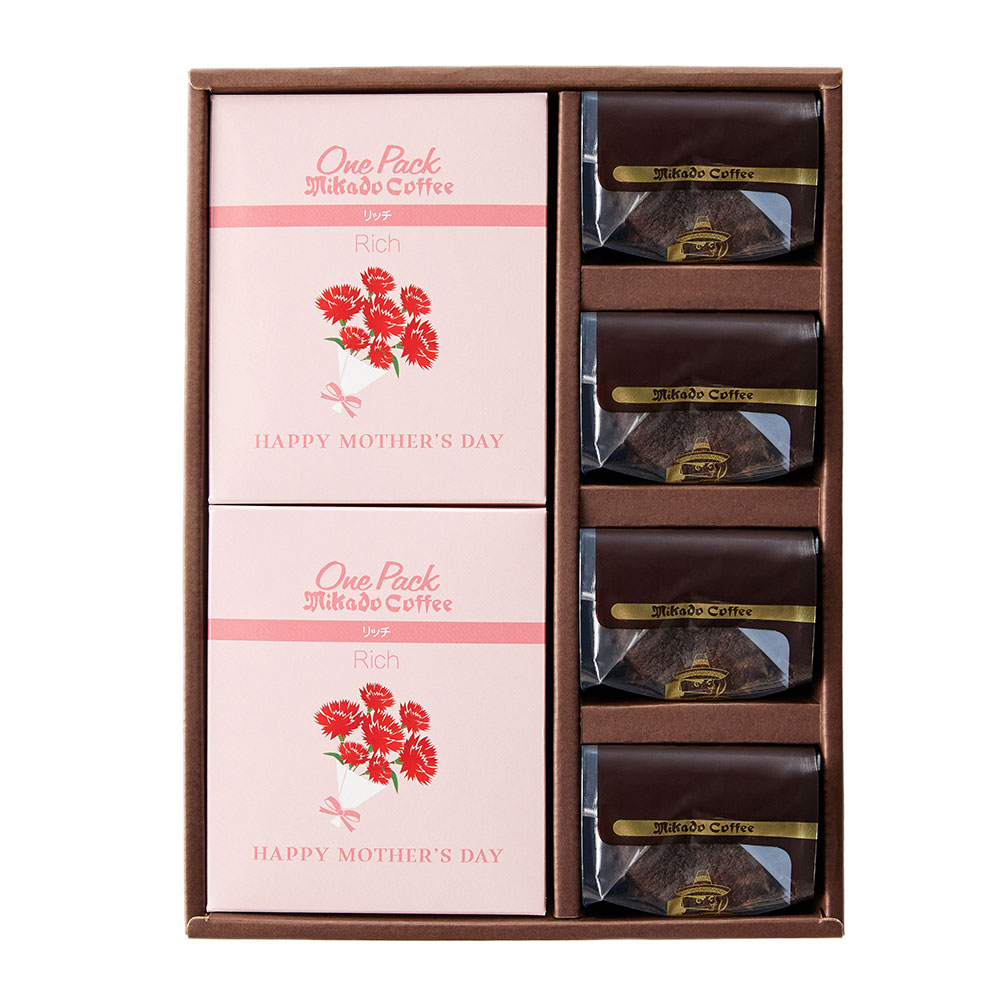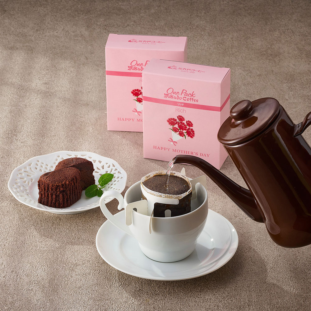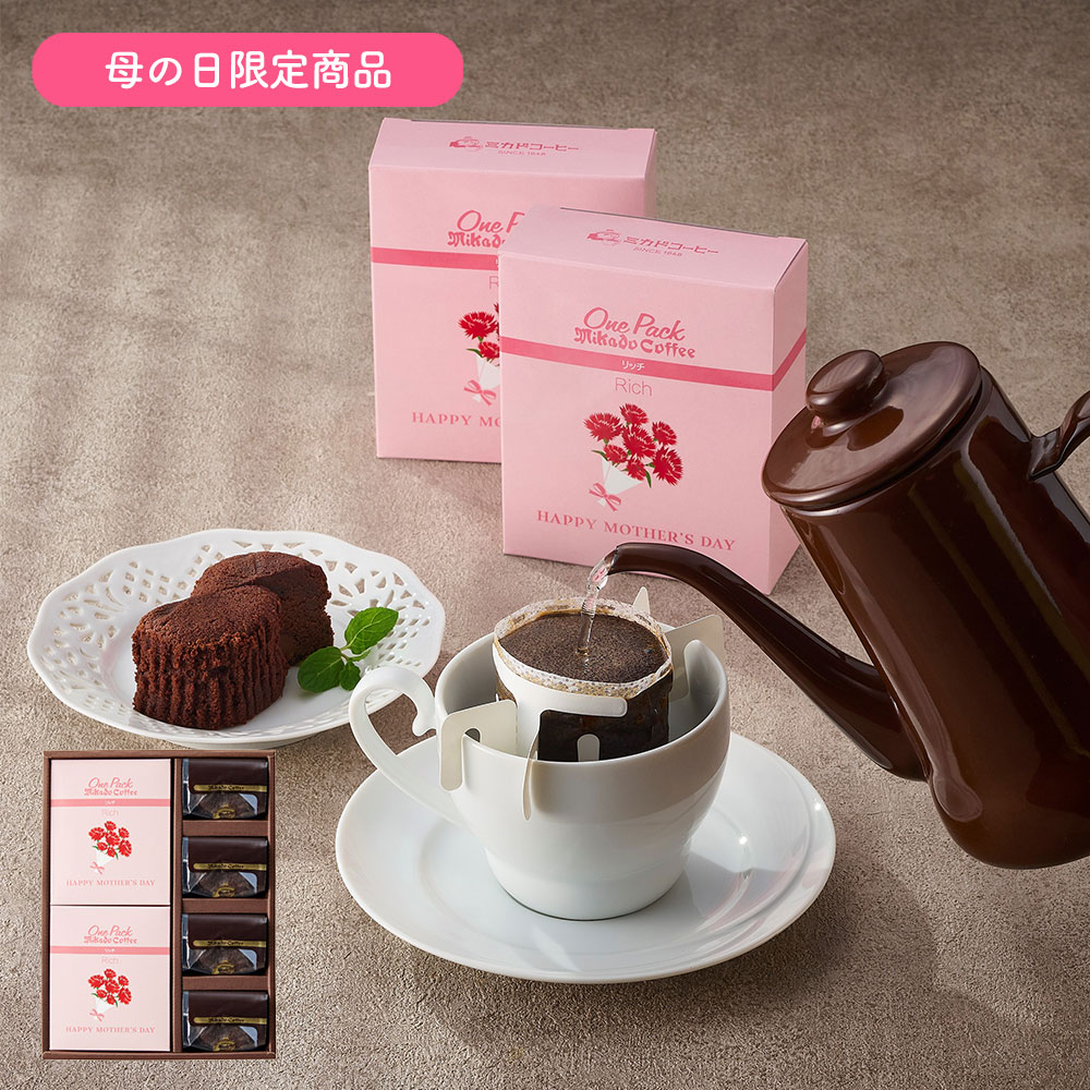 1948年、東京・日本橋創業の老舗コーヒーロースター ミカド珈琲 がお届けする、しっとり濃厚なチョコレートの焼菓子と、いつでもどこでもお湯を注ぐだけで手軽にレギュラーコーヒーの味わいをお楽しみいただける母の日専用パッケージのワンパックコーヒーギフトです。