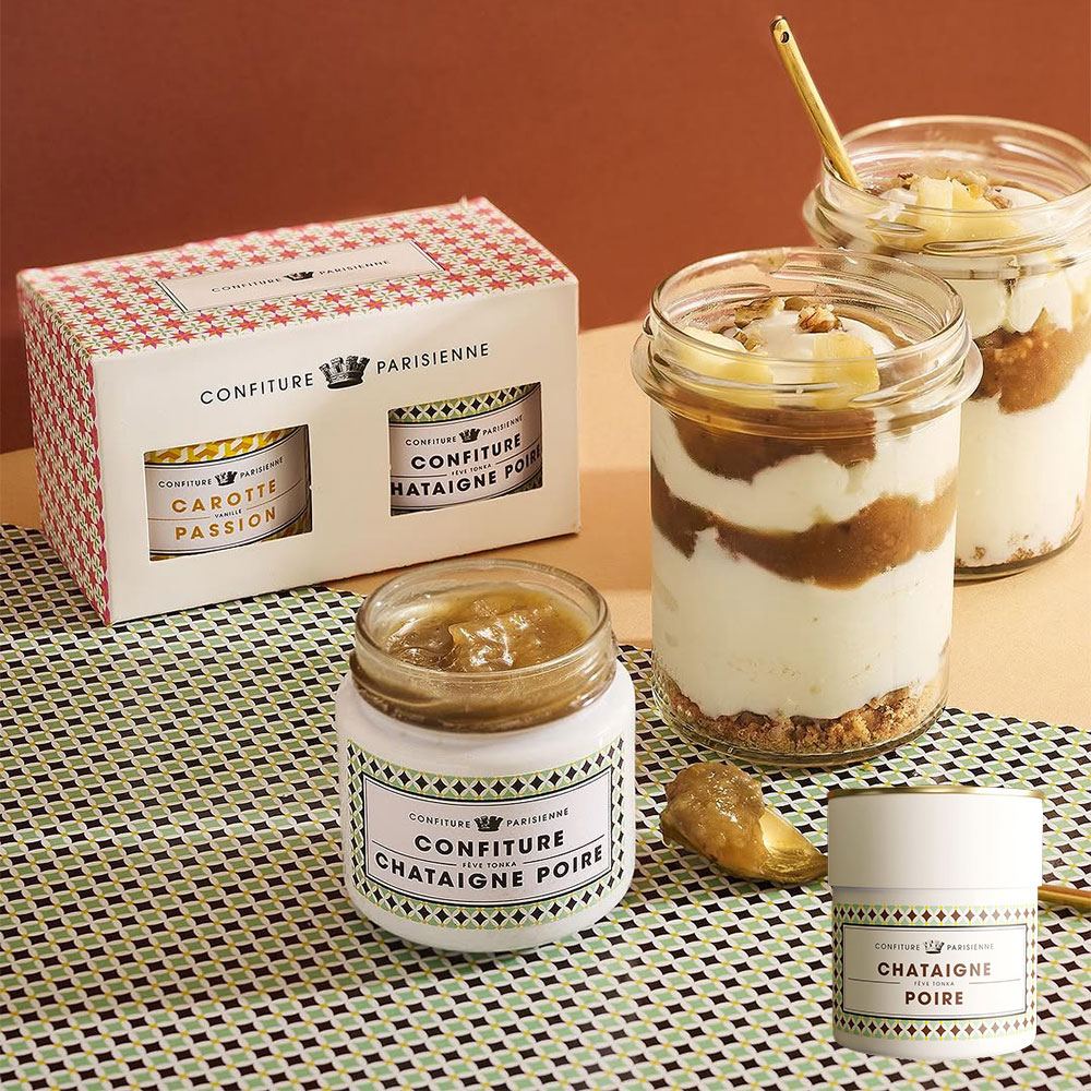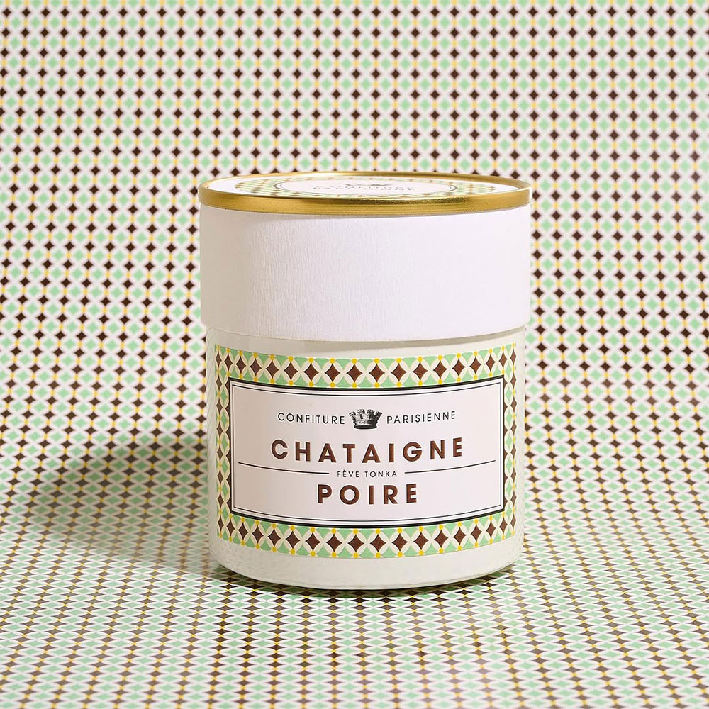 栗(シャテーヌ)の濃厚な甘さに、ジューシーで香り高い洋梨(ポワール)を合わせ、さらにトンカ豆の華やかなアロマを重ねた、秋冬を思わせる贅沢なミックスジャム。ベルベットのようになめらかな口当たりと深いコクが特徴で、バゲットやクロワッサンにはもちろん、バニラアイスやパンケーキ、焼き菓子のフィリングとしても相性抜群。奥行きのある香りと柔らかな甘さは、紅茶やコーヒーにもよく合います。パリジェンヌの感性が紡ぎ出す、温かみあふれる一瓶です。