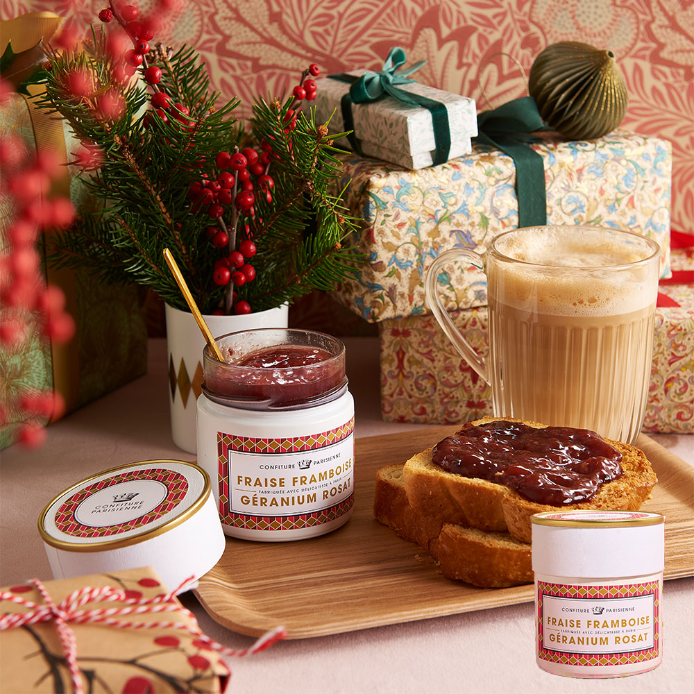 イチゴの甘みとラズベリーの酸味に、ローズゼラニウムのフローラルな香りを重ねた、パリらしい優雅さが詰まったジャム。素材本来のフルーティーさが際立ちながら、花の香りがふんわりと広がり、スプーンひとさじで気分が華やぐ味わい。パンやヨーグルトにはもちろん、紅茶に入れて香りづけにするのもおすすめ。日常を少し豊かにしてくれる、香りのレイヤーが美しい一品です。