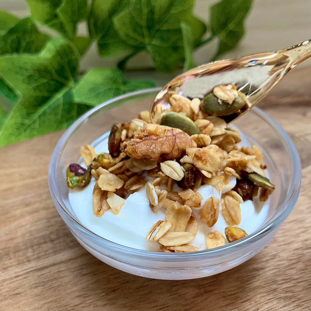 有機オーツ麦の他に、アーモンド・くるみ・かぼちゃの種・ココナッツ・ピスタチオがたっぷり入った栄養満点のグラノーラです。オーツ麦には腸内環境を整える食物繊維が豊富です。