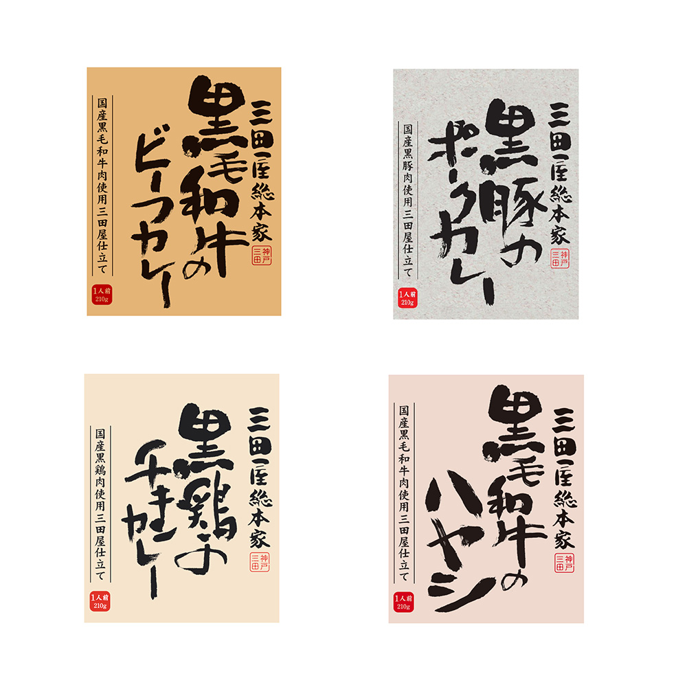 黒毛和牛を使用した贅沢な旨味のビーフカレー、黒豚の旨味が味わえるポークカレー、高級食材の黒鶏を使用し、鶏肉の食感を残し旨みたっぷりに仕上げたチキンカレー、黒毛和牛を使用したトマトの酸味と黒毛和牛の旨味が絶妙なこだわりビーフハヤシの4種類を味わえるギフトセット。黒毛和牛・黒鶏・黒豚と肉にこだわった、三田屋総本家の贅沢なセレクションギフトです。