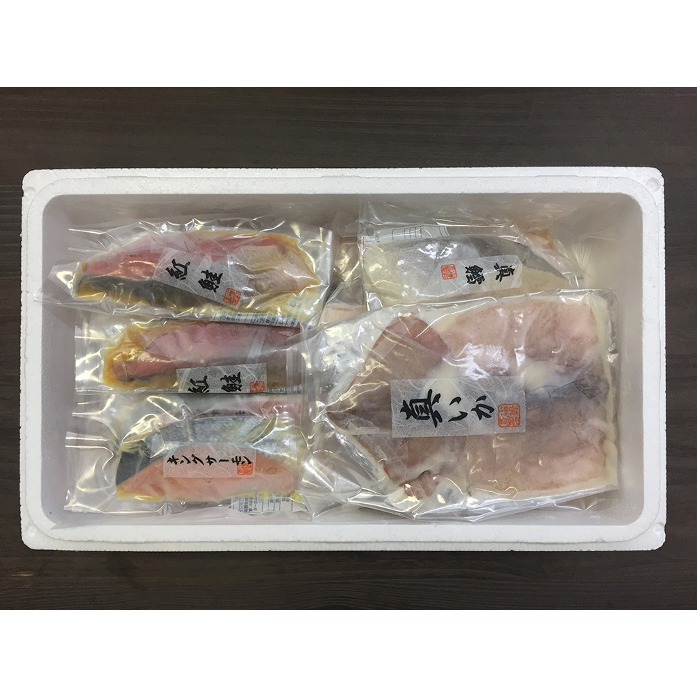■規格:秋鮭甘味噌漬切身70g×2、しまほっけ甘味噌漬切身70g×2、紅鮭粕漬切身70g×2、銀鱈粕漬切身70g×2、トラウトサーモン粕漬切身70g×2、真鱈粕漬切身70g×2、紅鮭西京漬切身70g×2、キングサーモン西京漬切身70g×2、真いか粕漬け120g×2