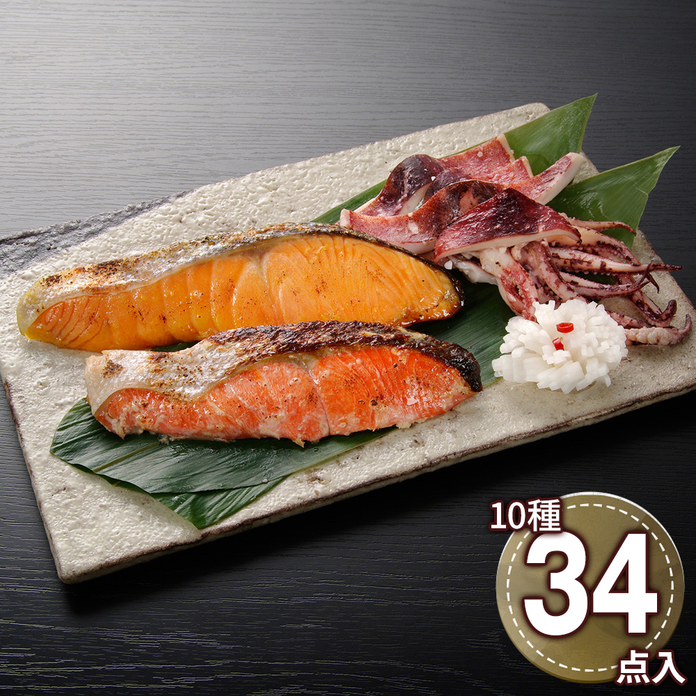 ■規格:秋鮭甘味噌漬切身70g×3、しまほっけ甘味噌漬切身70g×3、紅鮭粕漬切身70g×4、銀鱈粕漬切身70g×4、トラウトサーモン粕漬切身70g×3、真鱈粕漬切身70g×3、紅鮭西京漬切身70g×3、キングサーモン西京漬切身70g×4、アラスカ吉次西京漬切身70g×4、真いか粕漬け120g×3
