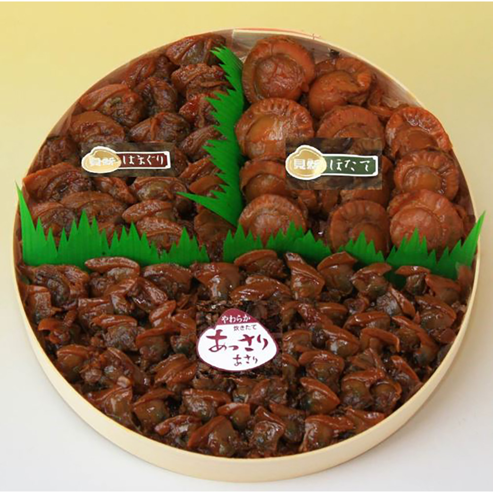 ■規格:あっさりあさり180g、若だき中蛤70g、ホタテ志ぐれ70g