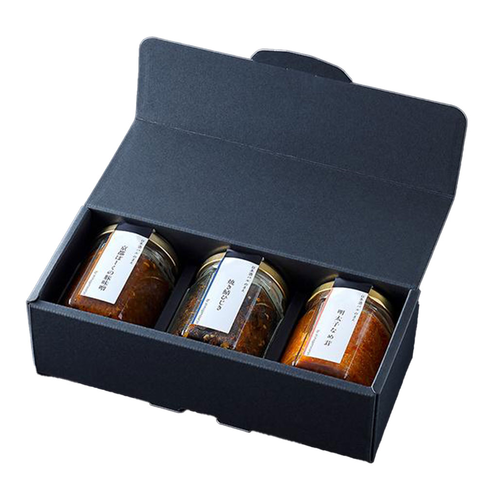 <京都ぽーくの豚味噌>京都で育て、京都で加工した、京都府独自の銘柄豚「京都ぽーく」のミンチを使用し、麦味噌、葱、牛蒡などを加え、白いご飯に合うよう濃厚な味付けに仕立てました。冷奴やふろふき大根など、万能の常備菜として日々の食卓に幅広く活用していただけます。<焼き鯖ひじき>脂が乗った鯖を丁寧に骨抜きし、直火で香ばしく焼き上げ、ひじき・海苔を加えて特製醤油で炊き上げました。鯖は現代人に必要な栄養素を沢山含んでおり、おにぎりやふりかけ・お茶漬けとして手軽にお愉しみいただけます。<明太子なめ茸>歯ごたえを残しつつ柔らかく炊き上げた国産えのき茸とプチプチとした食感と程よい辛味の明太子が調和。旨味と辛味を手軽に味わえ、一度食べたらやみつきに。ご飯のお供や酒の肴はもちろん、玉子焼きの具としてもおすすめです。