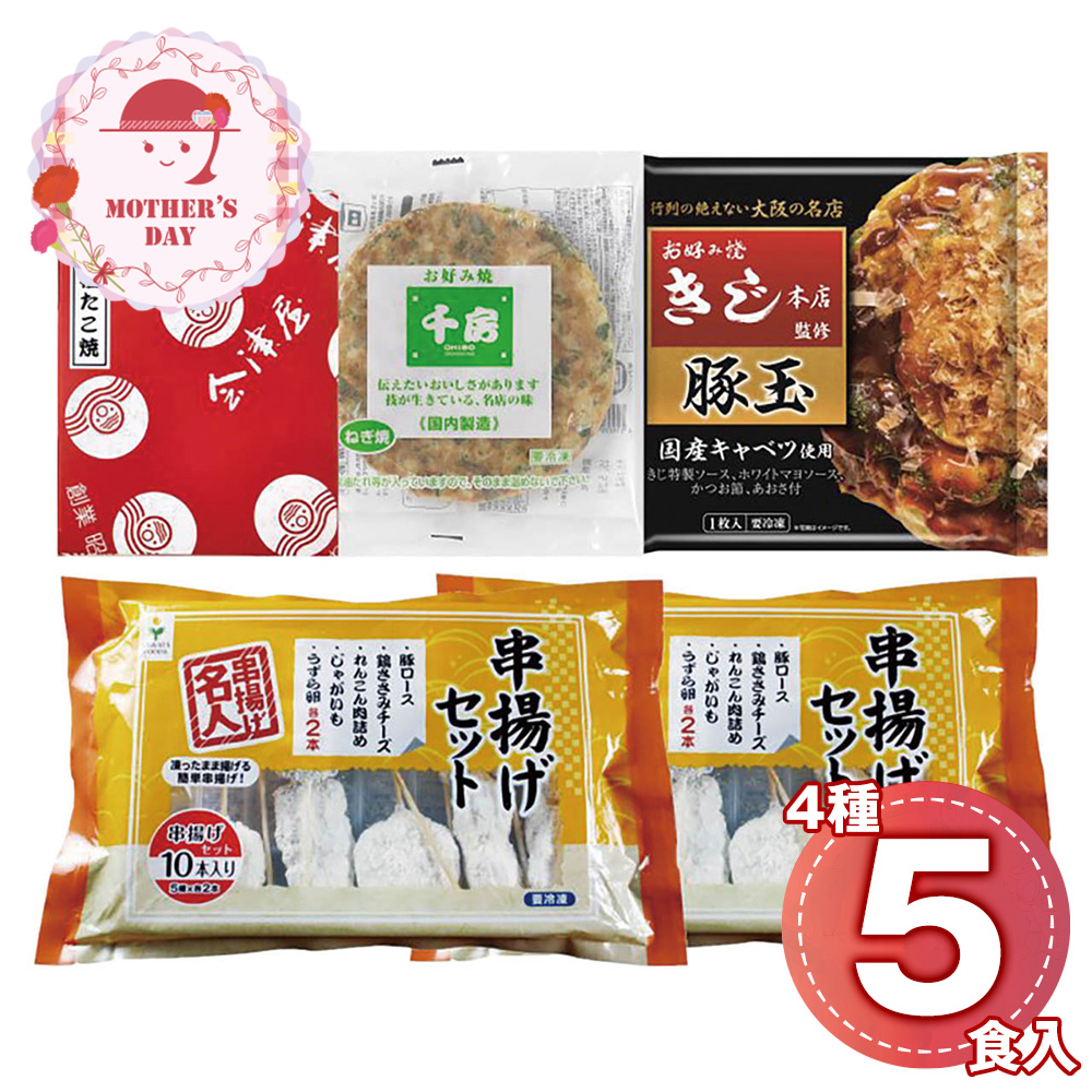 【母の日】 ザ・大阪!粉もん&串カツ食い倒れセット<5品> 6607-50 1852-985 【二重包装不可】《お届け期間:2026年5月8日~2026年5月10日》 / 冷凍 送料無料 セット ギフト お好み焼き たこ焼き 粉もん