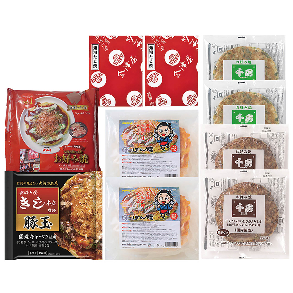 ■規格:千房ねぎ焼き180g、千房豚モダン焼き220g、ぼてぢゅう豚玉240g、元祖たこ焼き(12個入)150g×各2、ゆかり特選ミックス焼き220g、きじ豚玉256g×各1