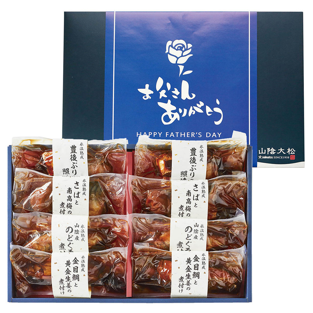【父の日限定包装でお届けします】 氷結点までの温度帯で加工・熟成する『氷温熟成法』によって魚の鮮度を損なう事無く旨みを引き出しました。山陰産の高級魚『のどぐろ』を始め日本各地の特色ある原料を使用したこだわりのお魚惣菜詰合せです。真空パックの個別包装で保存性も良く、電子レンジまたは湯煎による簡単調理でお召上がり頂ける手間いらずの御馳走です。ダイマツが自信を持ってお届けする氷温熟成の味を是非ご賞味下さい。(大分県産 豊後ぶり、山陰産のどぐろ、紀州南高梅、高知県産 黄金生姜を使用)