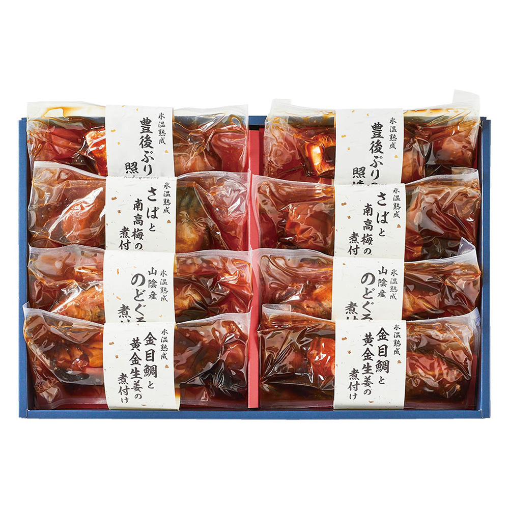 ■規格:金目鯛と黄金生姜の煮付け100g×2、さばと南高梅の煮付け110g×2、豊後ぶりの照焼き90g×2、山陰産のどぐろの煮付け85g×2
