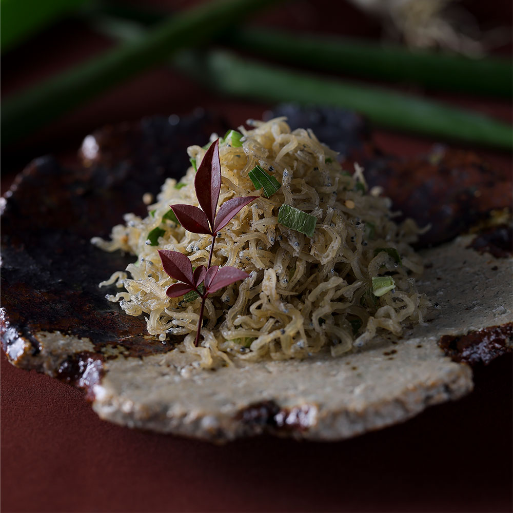 京都の伝統的な野菜の一つ「九条ネギ」。九条ネギに白ごまとちりめんじゃこを絡めて炊き上げました。下鴨茶寮のちりめん山椒は、鮮やかな山椒の碧が特徴です。国産の良質なちりめんじゃこ・実山椒を使用し、職人が昔ながらの手法で上品に炊き上げました。
