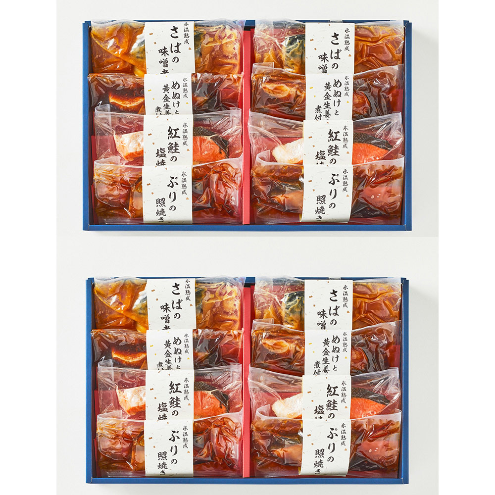 ■規格:【めぬけと黄金生姜の煮付け100g×2、さばの味噌煮90g×2、紅鮭の塩焼き60g×2、ぶりの照焼き90g×2】×2