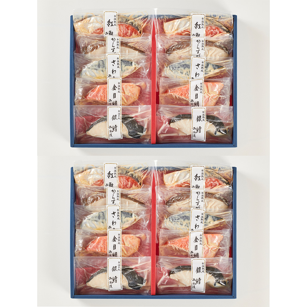 ■規格:【銀だら西京漬け70g×2、さわら西京漬け70g×2、紅鮭西京漬け70g×2、からすがれい西京漬け70g×2、金目鯛西京漬け70g×2】×2