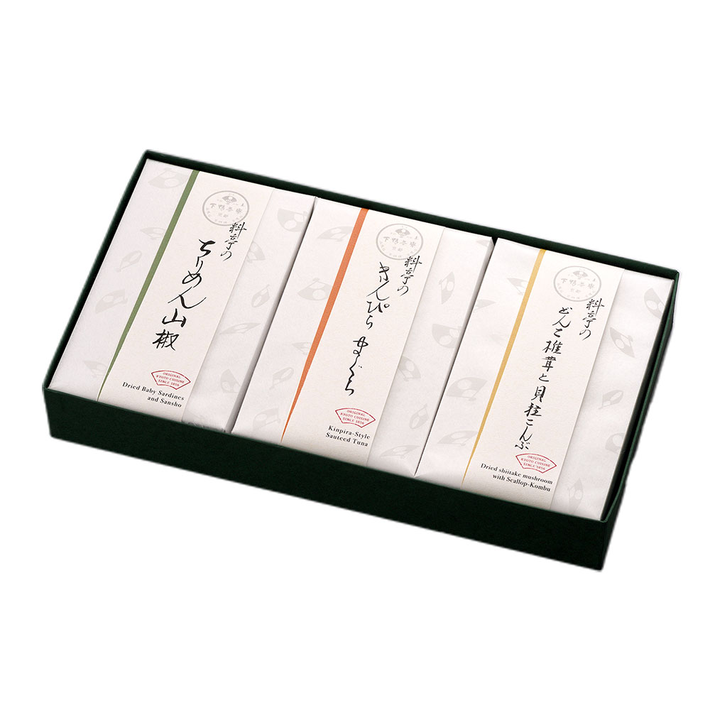 ちりめん山椒、きんぴらまぐろ、どんこ椎茸と貝柱こんぶの3種詰合せ。