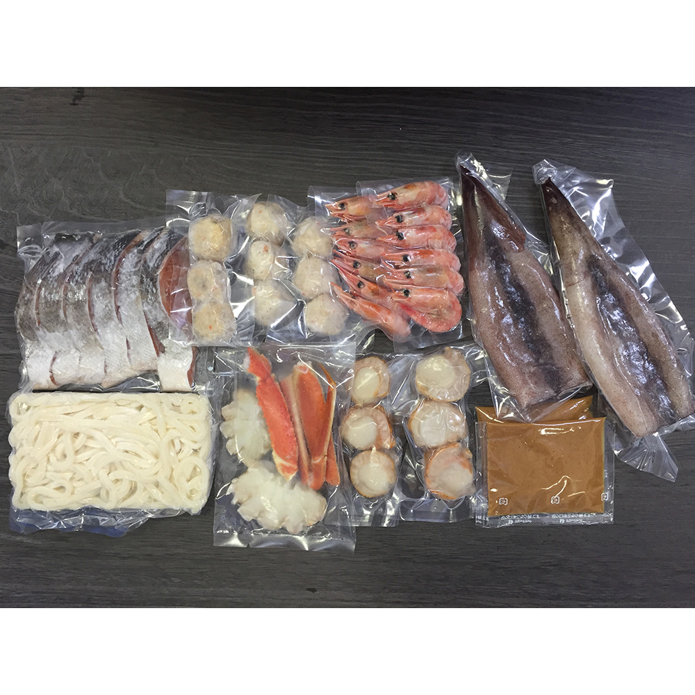 ■原材料名/食品添加物:【鍋具材】秋鮭(白鮭(北海道産)、食塩)、スルメイカ(北海道産)、ホタテガイ(北海道産)、ゆでずわいがに(ズワイガニ(ロシア産)、食塩)、ボイル海老(甘エビ(カナダ産)、食塩)、かに入りつみれ(魚肉すり身、豚脂、澱粉、粒状大豆たん白、全卵、魚介エキス、上白糖、たまねぎ、食塩、本みりん、かに正肉)、えび入りつみれ(魚肉すり身、豚脂、魚介類(おきあみ、えび)、澱粉、粒状大豆たん白、野菜(玉ねぎ、ねぎ)、上白糖、食塩、魚介エキス、本みりん)、とりごぼうつみれ(魚肉すり身、鶏肉、種もの(玉ねぎ、ごぼう、人参、生姜)、鶏ひき肉、パン粉、全卵、粒状大豆たん白、砂糖、小麦粉、食塩、発酵調味料、魚介エキス、白味噌、蛋白加水分解物)/加工澱粉、ソルビット、調味料(アミノ酸等)、リン酸塩(Na)、香料、(一部に卵・乳成分・小麦・かに・えび・豚肉・鶏肉・大豆・さけ・いかを含む)【うどん】小麦粉(国内製造)、食塩/加工澱粉、(一部に小麦を含む)【たれ】味噌(国内製造)、食塩、ごま、砂糖、小麦粉、ポークエキス、アップルクリーム、ビーフエキス、チキンエキス、酵母エキス/調味料(アミノ酸等)、酒精、増粘剤(キサンタンガム)、(一部に乳成分・小麦・大豆・ごま・鶏肉・りんご・牛肉・豚肉を含む)