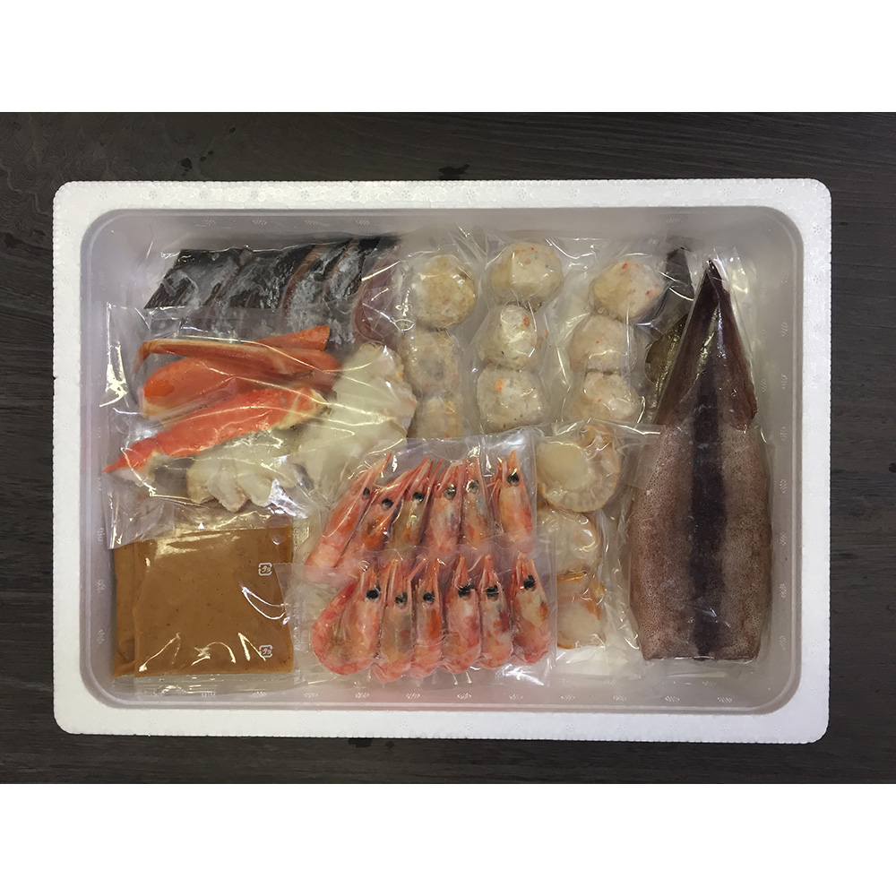 ■規格:秋鮭切身40g×6切、ゆでずわいがにカット100g×1袋、ボイル海老×12尾、ボイル帆立×6個、かに入つみれ×3個、えび入つみれ×3個、とりごぼうつみれ×3個、ツボ抜きいか100g×2尾、冷凍うどん250g×1玉、たれ(濃縮:味噌仕立て)50g×2袋