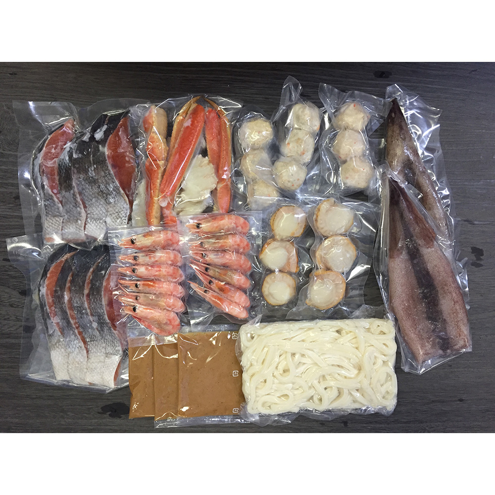 ■規格:秋鮭切身40g×8切、ゆでずわいがにカット200g×1袋、ボイル海老×12尾、ボイル帆立×6個、かに入つみれ×3個、えび入つみれ×3個、とりごぼうつみれ×3個、ツボ抜きいか100g×2尾、冷凍うどん250g×1玉、たれ(濃縮:味噌仕立て)50g×3袋