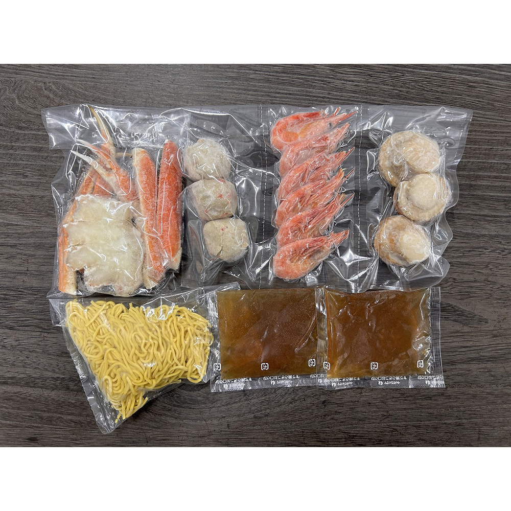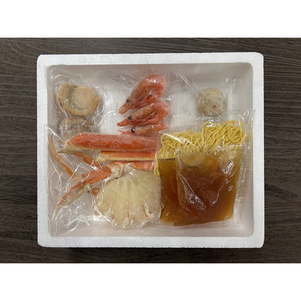 ■規格:ゆでずわいがにカット100g×1袋、ボイル海老×6尾、ボイル帆立×3個、かに入つみれ×3個、冷凍生ラーメン80g×1玉、たれ(濃縮:塩仕立て)50ml×2袋