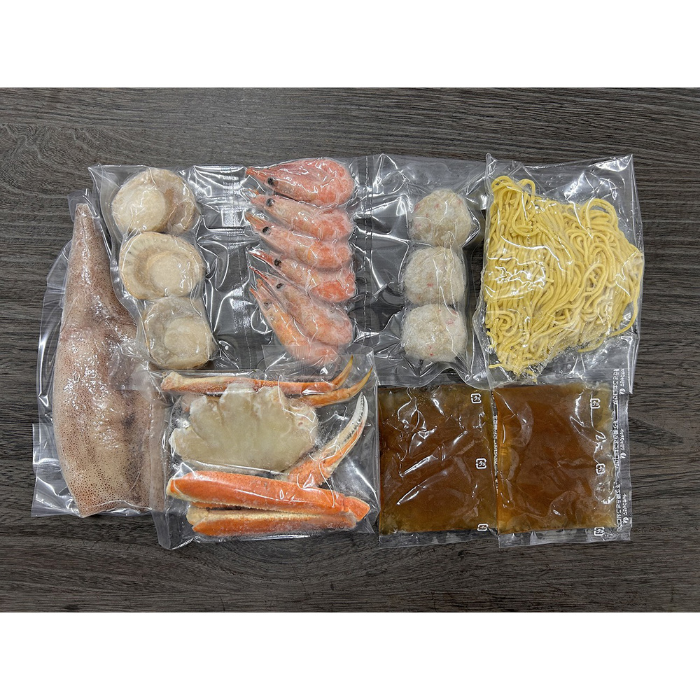■規格:ゆでずわいがにカット100g×1袋、ボイル海老×6尾、ボイル帆立×3個、かに入つみれ×3個、ツボ抜きいか100g×1尾、冷凍生ラーメン80g×1玉、たれ(濃縮:塩仕立て)50ml×2袋