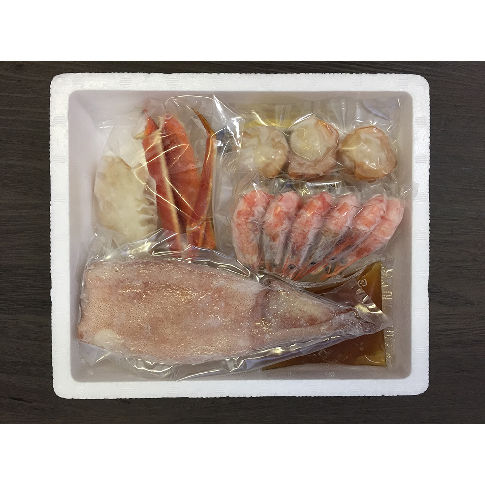 ■原材料名/食品添加物:【鍋具材】ゆでずわいがに(ズワイガニ(ロシア産)、食塩)、スルメイカ(北海道産)、ホタテガイ(北海道産)、かに入りつみれ(魚肉すり身、豚脂、澱粉、粒状大豆たん白、全卵、魚介エキス、上白糖、たまねぎ、食塩、本みりん、かに正肉)、ボイル海老(甘エビ(カナダ産)、食塩)/ソルビット、調味料(アミノ酸等)、リン酸塩(Na)、香料、(一部に卵・小麦・かに・えび・いか・豚肉・大豆を含む)【しお鍋たれ】食塩(国内製造)、発酵調味液、醤油、蛋白加水分解物、こんぶ調味液、魚醤、醸造酢、香辛料/調味料(アミノ酸等)、(一部に小麦・大豆・えび・ゼラチンを含む)【ラーメン】小麦粉(国内製造)、植物油脂、小麦たん白、卵白粉、食塩/酒精、かんすい、着色料(クチナシ)、(一部に小麦・卵を含む)