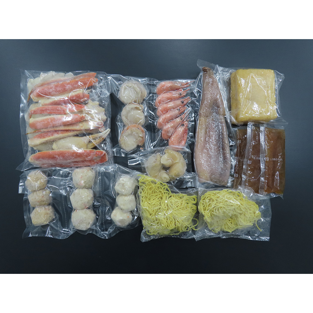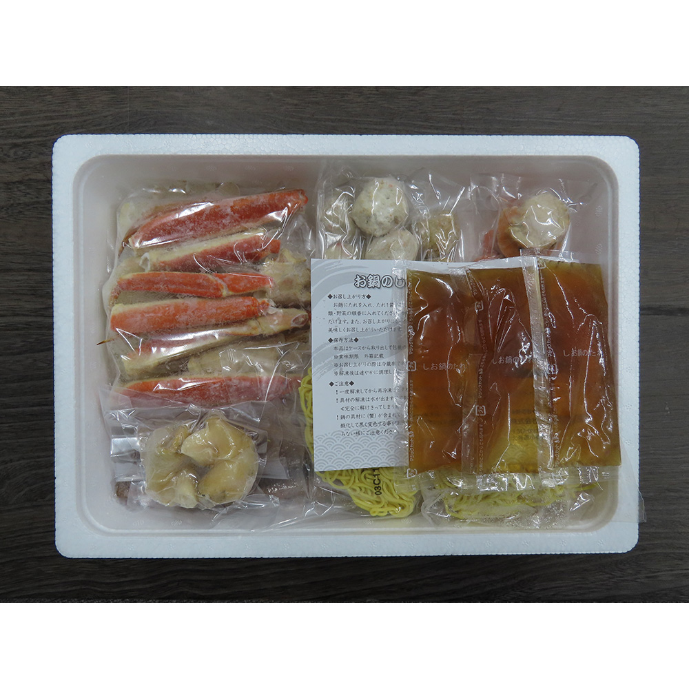 ■原材料名/食品添加物:【鍋具材】ゆでずわいがに(ズワイガニ(ロシア産)、食塩)、スルメイカ(北海道産)、ホタテガイ(北海道産)、かに入りつみれ(魚肉すり身、豚脂、澱粉、種もの(魚肉すり身、豚脂、澱粉、粒状大豆たん白、全卵、魚介エキス、上白糖、たまねぎ、食塩、本みりん、かに正肉)、えび入りつみれ(魚肉すり身、豚脂、魚介類(おきあみ、えび)、澱粉、粒状大豆たん白、野菜(玉ねぎ、ねぎ)上白糖、食塩、魚介エキス、本みりん)、とりごぼうつみれ(魚肉すり身、鶏肉、種もの(玉ねぎ、ごぼう、人参、生姜)、鶏ひき肉、パン粉、全卵、粒状大豆たん白、砂糖、小麦粉、食塩、発酵調味料、魚介エキス、白味噌、蛋白加水分解物)、ツブ(カナダ産)、ボイル海老(甘エビ(カナダ産)、食塩)、油揚げ(大豆、植物油脂)/凝固剤、加工澱粉、ソルビット、調味料(アミノ酸等)、リン酸塩(Na)、香料、(一部に卵・乳成分・小麦・かに・えび・いか・豚肉・鶏肉・大豆を含む)【ラーメン】小麦粉(国内製造)、植物油脂、小麦たん白、卵白粉、食塩/酒精、かんすい、着色料(クチナシ)、(一部に小麦・卵を含む)【しお鍋たれ】食塩(国内製造)、発酵調味液、醤油、蛋白加水分解物、こんぶ調味液、魚醤、醸造酢、香辛料/調味料(アミノ酸等)、(一部に小麦・大豆・えび・ゼラチンを含む)