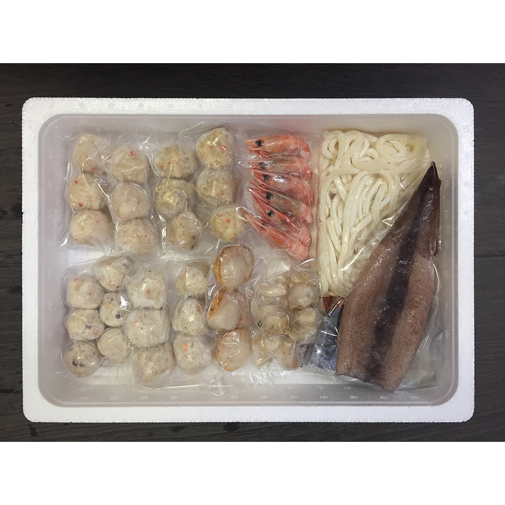 ■規格:かに入つみれ×6個、えび入つみれ×6個、とりごぼうつみれ×6個、たこ入つみれ×6個、ボイル海老×6尾、ボイル帆立×3個、ボイルつぶ60g×1袋、ツボ抜きいか100g×1尾、冷凍うどん250g×1玉、たれ(濃縮:醤油仕立て)50ml×2袋