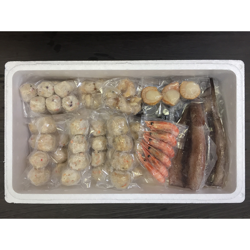 ■規格:かに入つみれ×12個、えび入つみれ×12個、とりごぼうつみれ×12個、たこ入つみれ×12個、ボイル海老×6尾、ボイル帆立×3個、ボイルつぶ60g×2袋、ツボ抜きいか100g×2尾、冷凍うどん250g×1玉、たれ(濃縮:醤油仕立て)50ml×4袋
