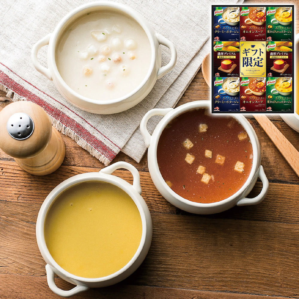 味の素 クノール プレミアムスープギフト(贅沢野菜北海道スイートコーン2袋入・ギフトレシピ3袋入(クリーミーポタージュ・オニオンスープ・栗かぼちゃのポタージュ)各2箱) KPZ-30V 1223-057 / 常温 送料無料 スープ セット