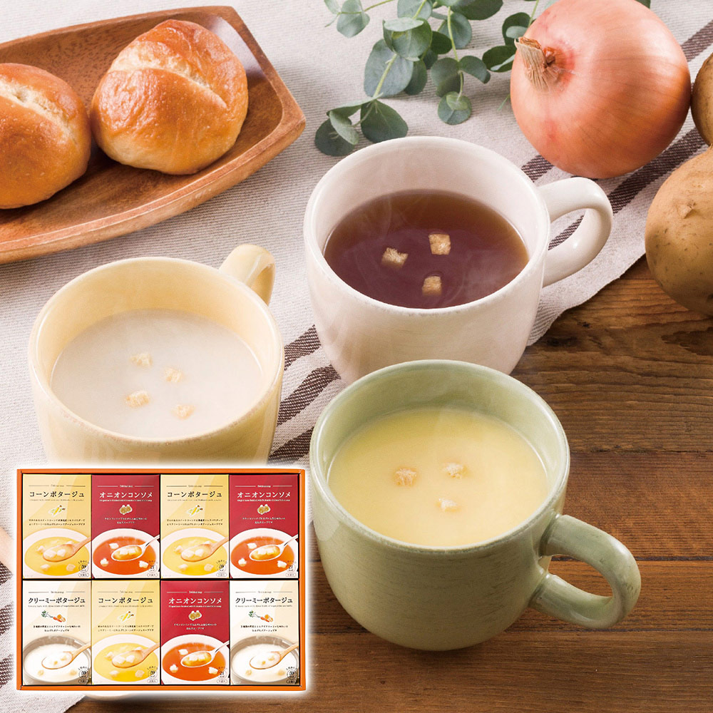 スイートコーンを使用したコーンポタージュ、チキンコンソメ入りのオニオンコンソメ、北海道ミルク入りのクリーミーポタージュの詰合せです。