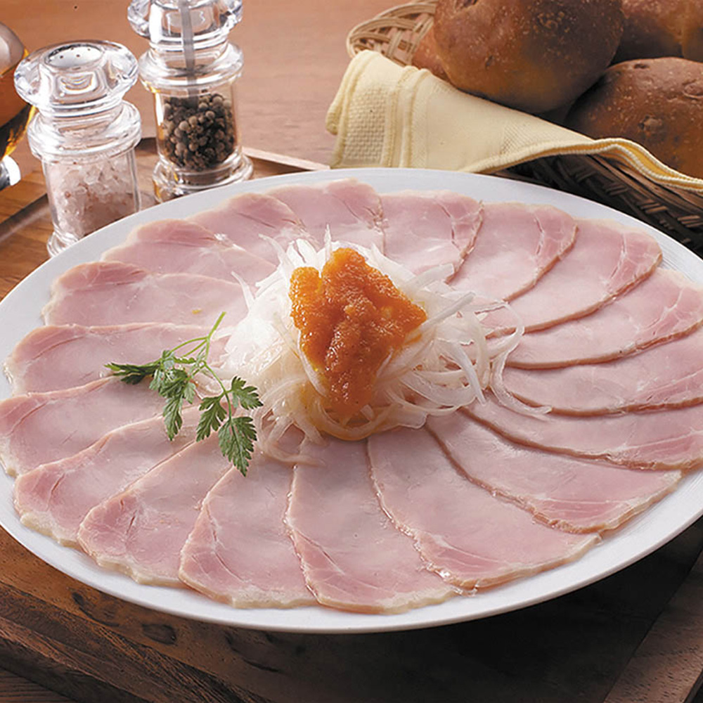 長期間熟成させ桜のチップでスモークした本格的なロースハムに塩分控えめのしっとりなめらかな白いハムの味比べセット。生野菜をたっぷりと使用したハム用ドレッシングと共にお召し上がり下さい。