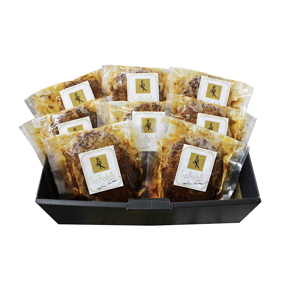 フレンチの鉄人ラ・ロシェル坂井宏行シェフのデミグラスソースハンバーグ。しっかり焼き目をつけ、中にお肉の旨みを閉じ込めたハンバーグを、じっくり煮込んだ野菜の酸味と甘みが溶け込んだ、こだわりのデミグラスソースと合わせました。フワフワのお肉に濃厚なデミグラスソースが、絶妙に絡み合う、まさに鉄人の一品です。本格フレンチの技がつまった絶品ハンバーグをご家庭で楽しめます。湯煎調理で簡単便利。