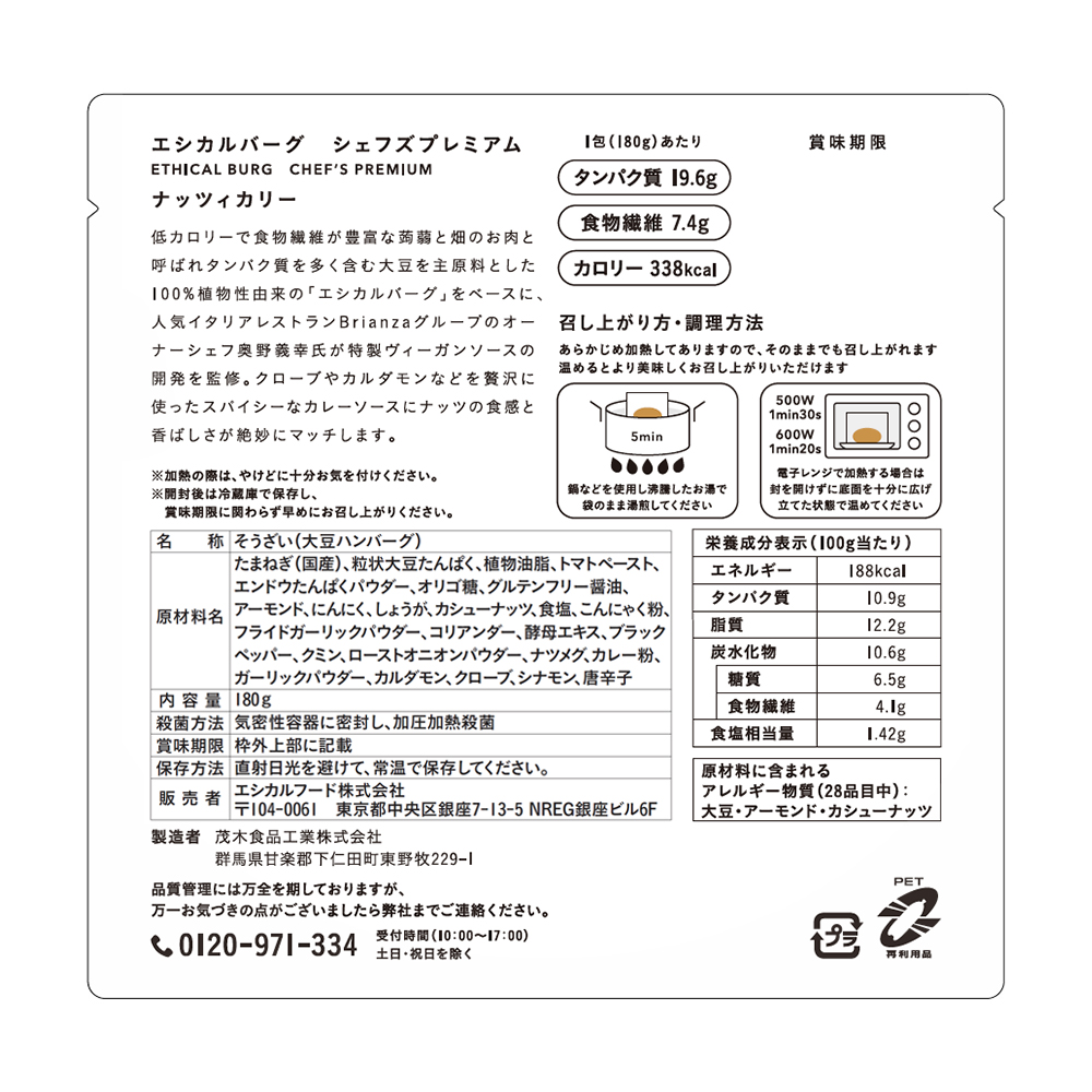 蒟蒻と大豆が主原料の100%植物性由来の「エシカルバーグ」をベースに、人気イタリアレストランBrianzaグループのオーナーシェフ奥野義幸氏が特製ヴィーガンソースの開発を監修。カレーソースは、クローブやカルダモンなどを贅沢に使ったスパイシーなカレーソースにナッツの食感と香ばしさが絶妙にマッチします。トマトソースは、イタリアの太陽の恵みをたっぷりと受けた熟成トマトペーストをふんだんに使用したソースがエシカルバーグの美味しさをさらに引き立てます。レンチンするか湯煎であたためて、調理完了。ご家庭で簡単に有名レストランの味がお楽しみいただけます。