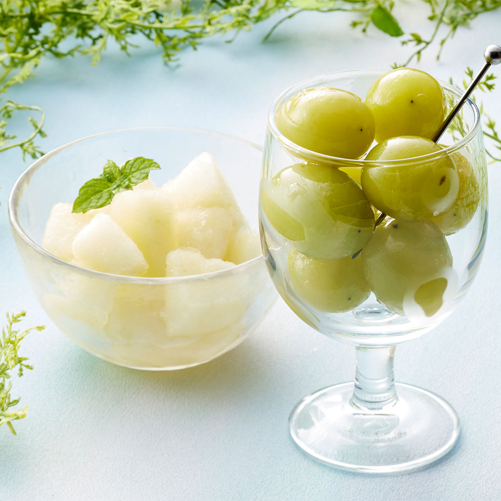 皮ごと食べられる大粒のシャインマスカットと、歯触りのいい甘くてジューシーなラ・フランス(洋ナシ)の2種を、一番おいしい旬のタイミングで、急速冷凍しました。半解凍でシャーベットでお召し上がりいただくほか、ジュースやお酒の氷の代わりとして、スムージーやデザートのトッピングなど、フルーツ本来の香りや甘さをお楽しみください。