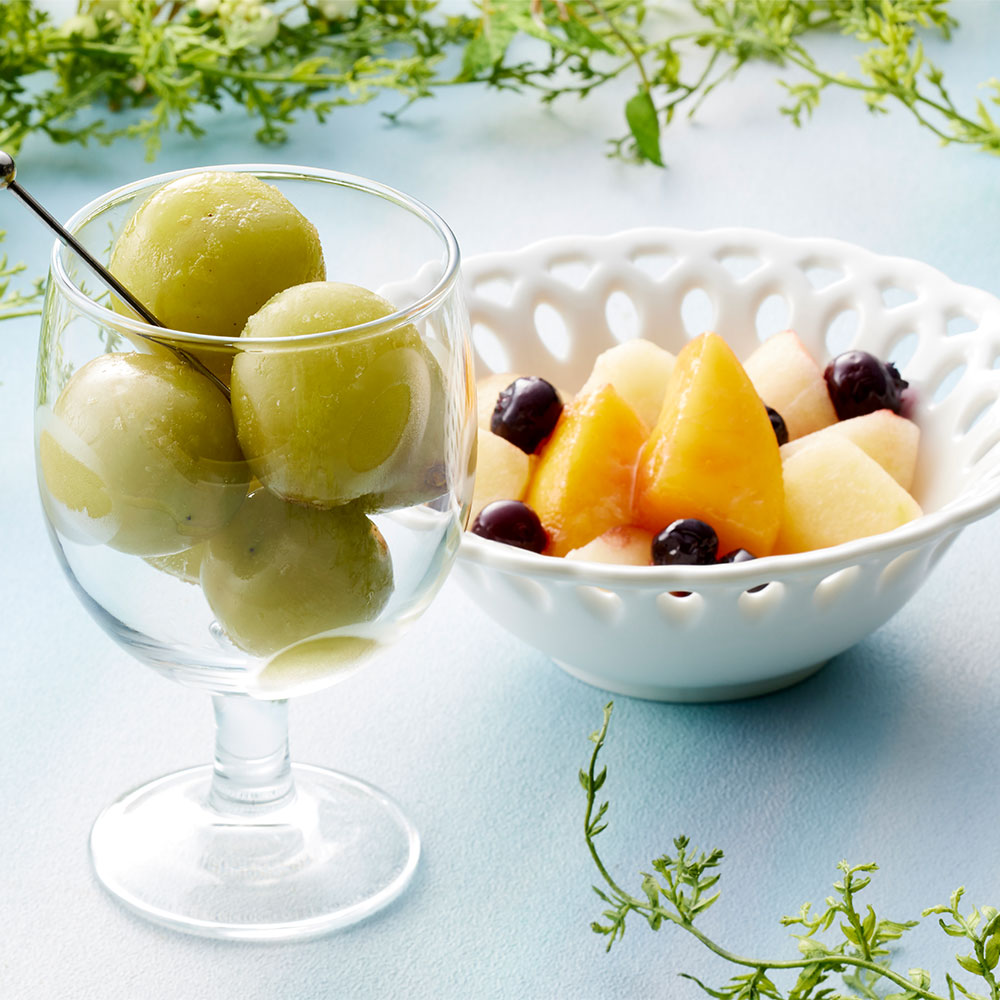 皮ごと食べられる大粒のシャインマスカットと、山形で育ったりんごと黄桃、ブルーベリーをミックスしたパックの2種を、一番おいしい旬のタイミングで、急速冷凍しました。半解凍でシャーベットでお召し上がりいただくほか、ジュースやお酒の氷の代わりとして、スムージーやデザートのトッピングなど、フルーツ本来の香りや甘さをお楽しみください。
