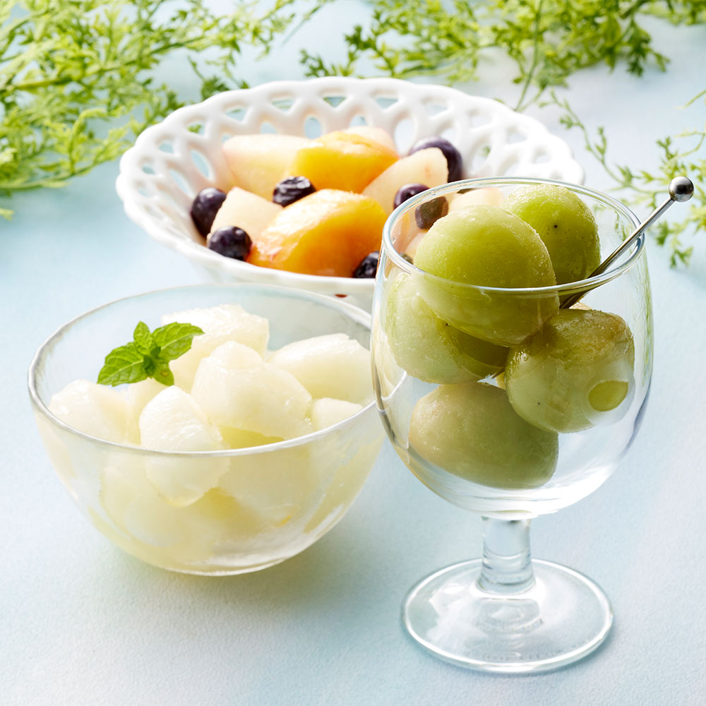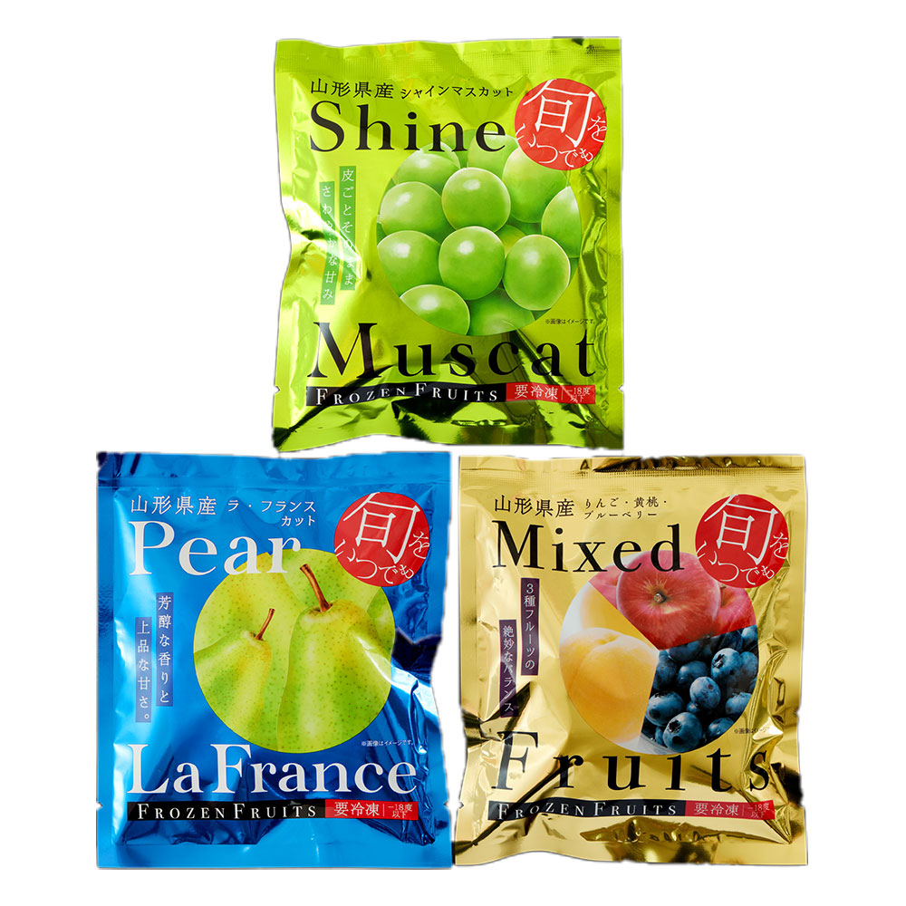 山形で育った皮ごと食べられる大粒のシャインマスカットと、歯触りのいい甘くてジューシーなラ・フランス(洋ナシ)、それとりんごと黄桃、ブルーベリーをミックスしたパックの3種を一番おいしい旬のタイミングで、急速冷凍しました。半解凍でシャーベットでお召し上がりいただくほか、ジュースやお酒の氷の代わりとして、スムージーやデザートのトッピングなど、フルーツ本来の香りや甘さをお楽しみください。
