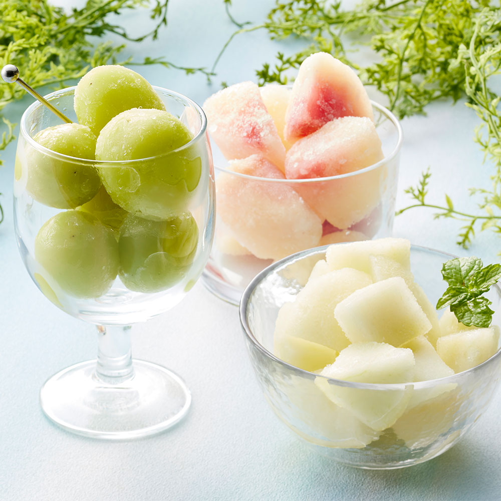 山形で育った皮ごと食べられる大粒のシャインマスカットと、完熟の白桃、歯触りのいい甘くてジューシーなラ・フランス(洋ナシ)のパック3種を一番おいしい旬のタイミングで、急速冷凍しました。半解凍でシャーベットでお召し上がりいただくほか、ジュースやお酒の氷の代わりとして、スムージーやデザートのトッピングなど、フルーツ本来の香りや甘さをお楽しみください。