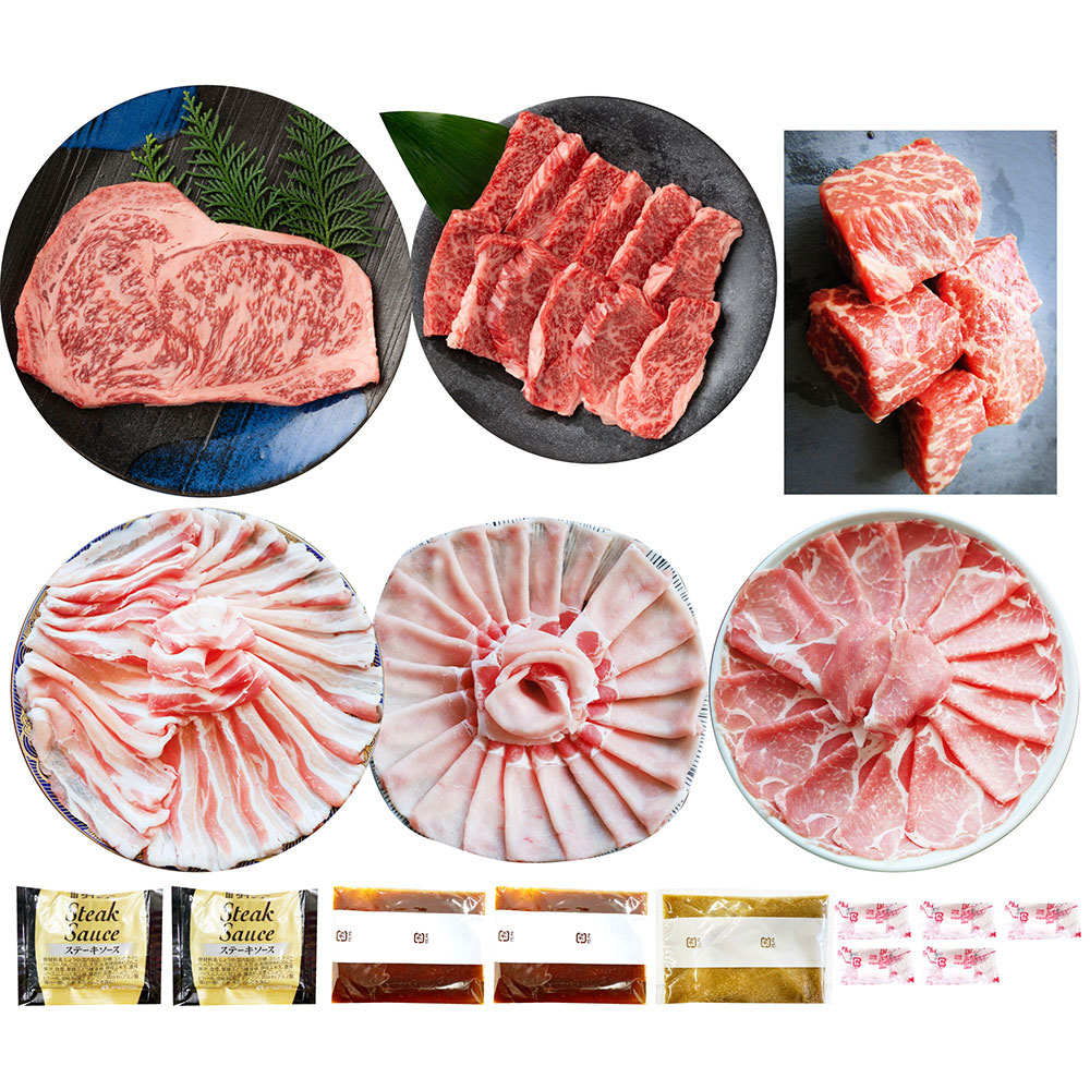■規格:オリーブ牛(ロースステーキ180g×1、バラ焼肉250g×1、(ランプサイコロステーキ150g×1)、オリーブ豚(ロースライス500g、肩ロースライス500g、バラライス500g)、ステーキソース25g×2、焼肉用のタレ30g×2、ごまだれ50g×1、牛脂×5