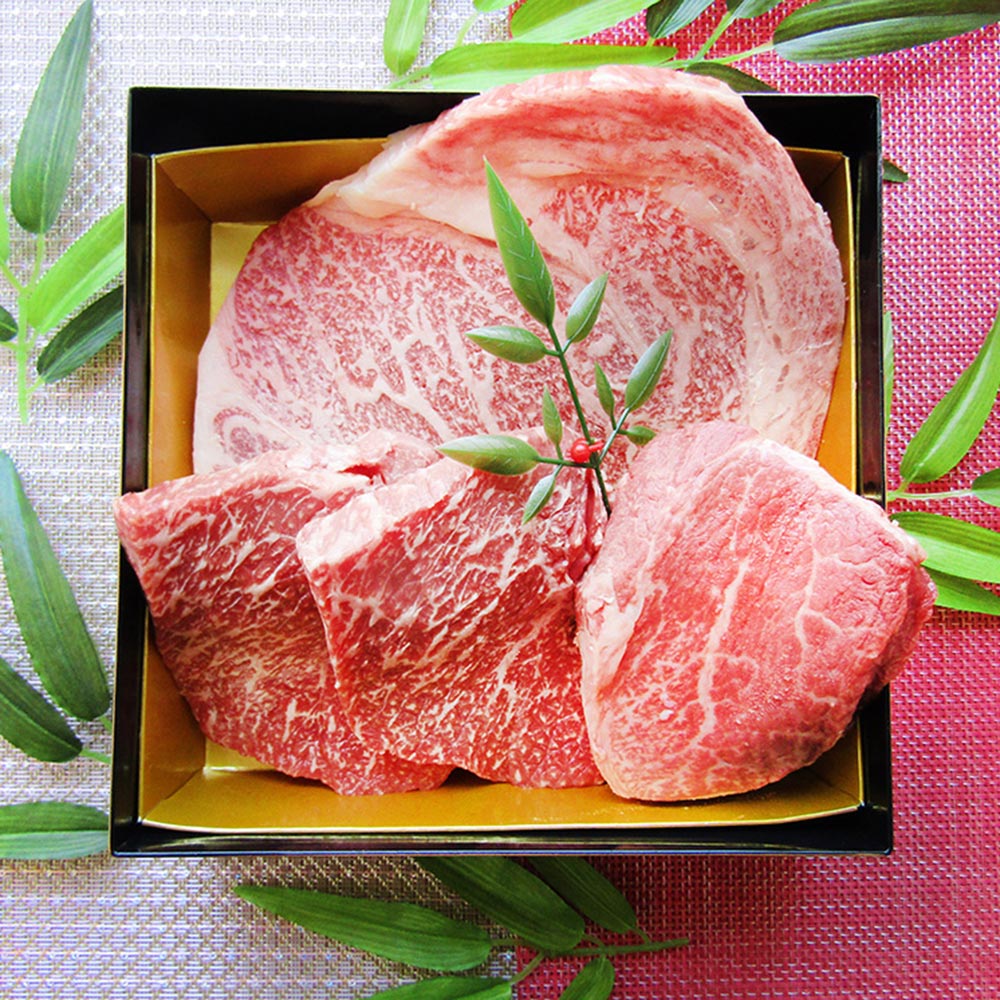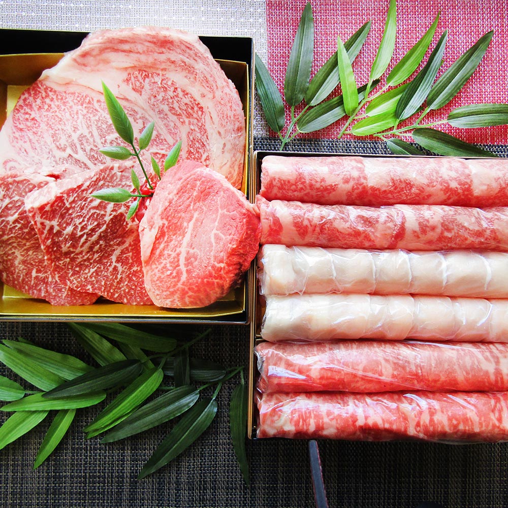 ■規格:オリーブ牛(ロースステーキ180g、ランプステーキ100g×2、イチボステーキ100g、バラスライス100g×2、ももスライス100g×2)、オリーブ豚ローススライス100g×2、ステーキソース25g×4、ごまだれ×3、牛脂×4