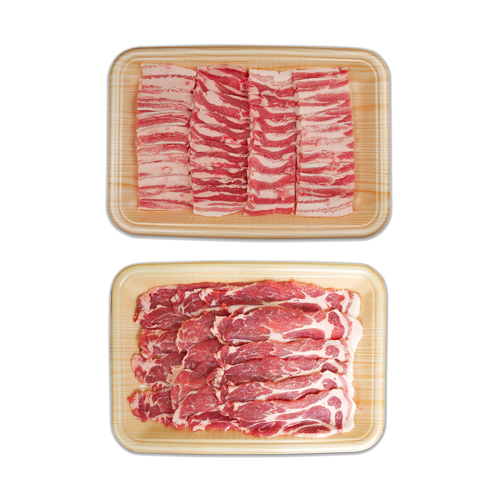 岐阜県特産の豚肉「ボーノポーク岐阜」のバラ焼肉と肩ロース焼肉2種類食べ比べをご用意しました。甘みのあるバラと脂身と赤身のバランスがとれた肩ロースそれぞれの肉の食感・旨味をご堪能ください。