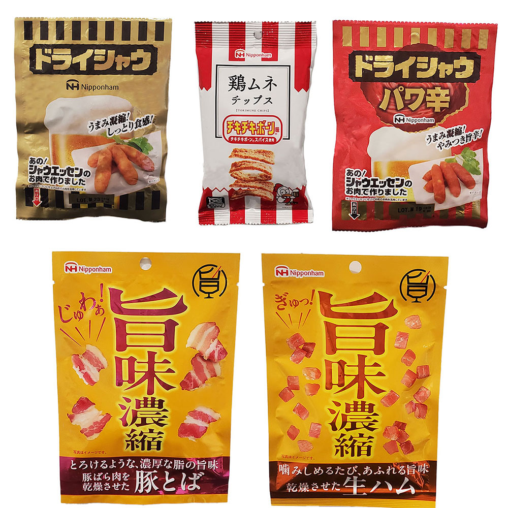 ■規格:●ドライシャウ37g×1●ドライシャウパワ辛35g×1●旨味濃縮 乾燥させた生ハム30g×1●旨味濃縮 乾燥させた豚とば21g×1●鶏ムネチップスチキチキボーン味27g×1