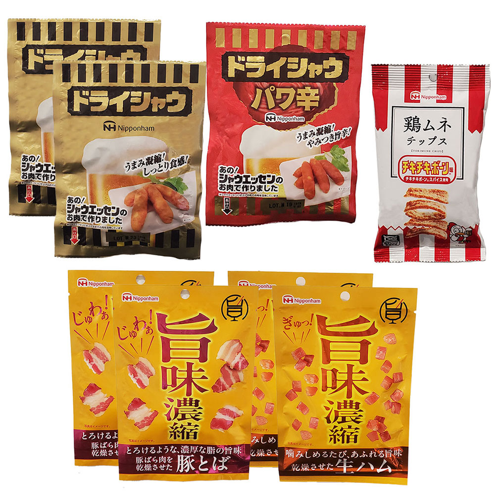 ■規格:●ドライシャウ37g×2●ドライシャウパワ辛35g×1●旨味濃縮 乾燥させた生ハム30g×2●旨味濃縮 乾燥させた豚とば21g×2●鶏ムネチップスチキチキボーン味27g×1