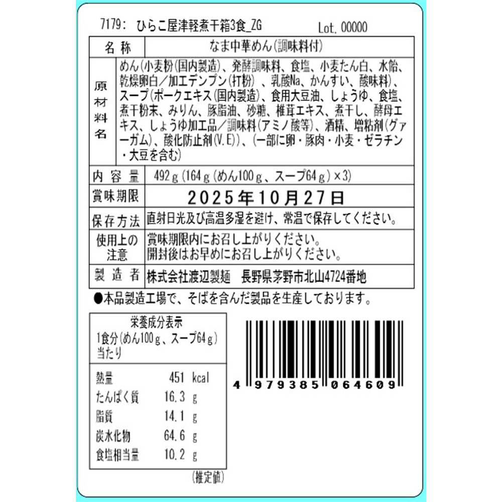 ■原材料名/食品添加物:麺[小麦粉(国内製造)、発酵調味料、食塩、小麦たん白、水飴、乾燥卵白(卵を含む)/乳酸Na、かんすい、酸味料、加工でん粉(打粉)]