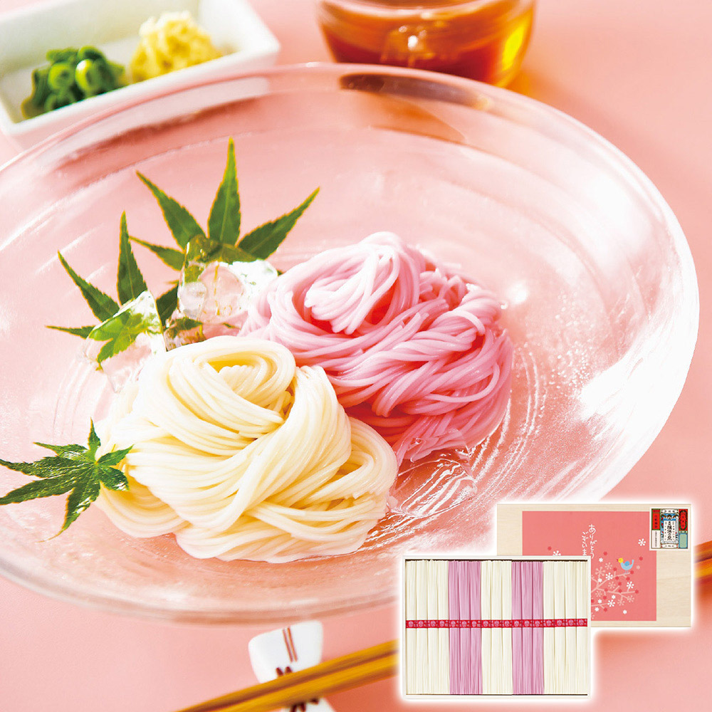 職人が丹精こめて作った手延素麺。鮮やかな紅白の詰め合わせが喜びと感謝を伝えます。