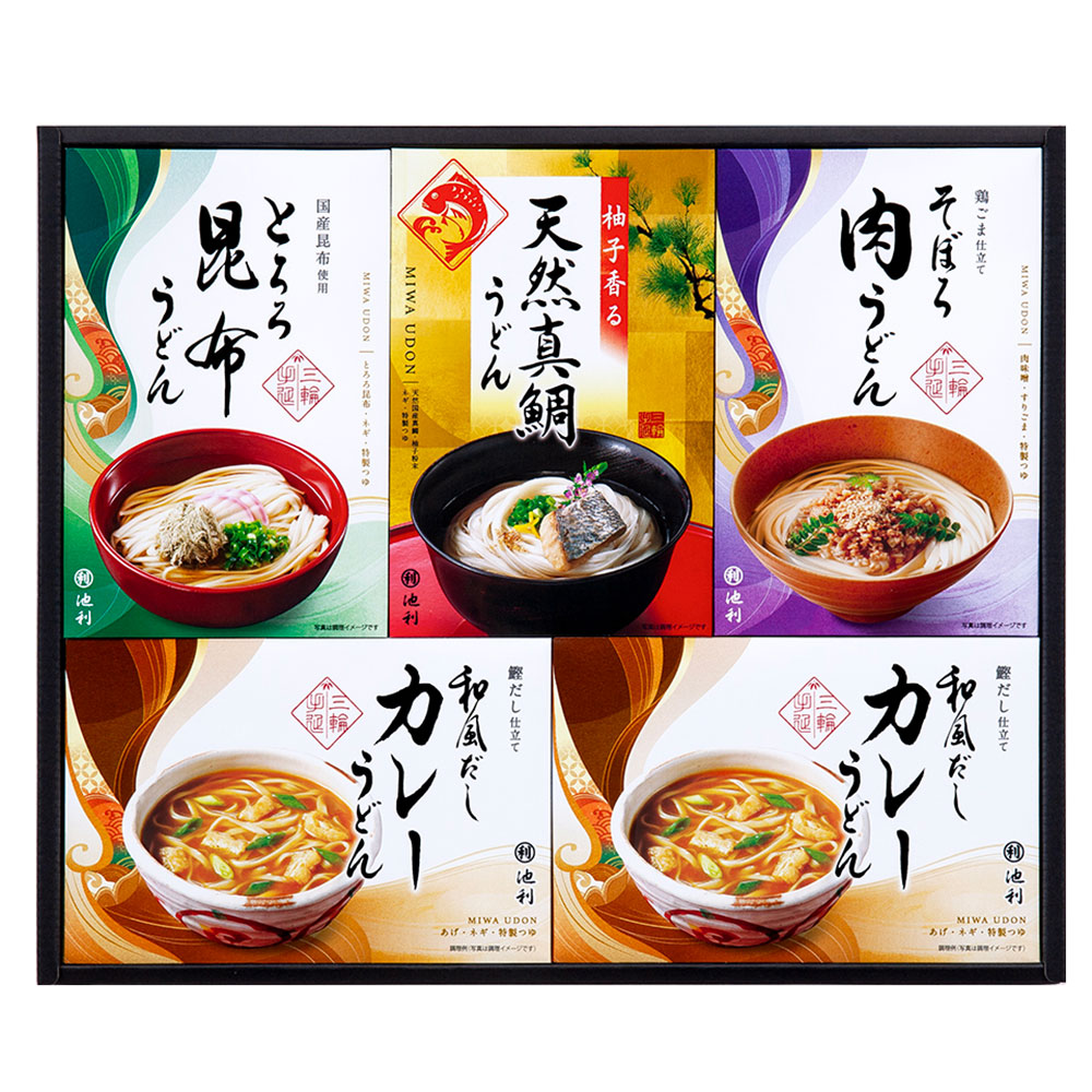 三輪うどんを、高級食材から池利定番人気の味まで様々なメニューでお楽しみいただけるバラエティ豊かな詰合せです。