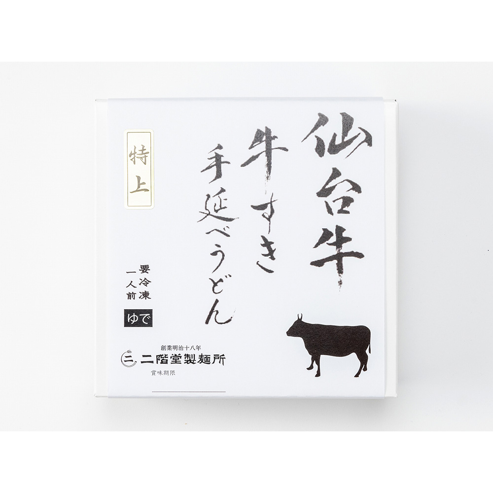 最高肉質五等級の仙台牛のサーロインを贅沢に使用しています。仙台牛のサーロインを贅沢に「すき焼き」用に薄くスライスし生の状態で冷凍しています。とろけるような食感の仙台牛をコシのある手延べうどん「むらさき」と、料理長監修の割下とともにお楽しみいただけます。