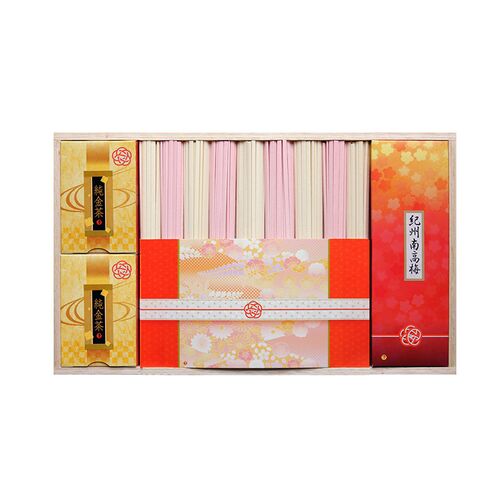 讃岐うどんと南高梅うどんにおめでたい席に合う純金茶、紀州産の南高梅を詰め合せた贈り物です。