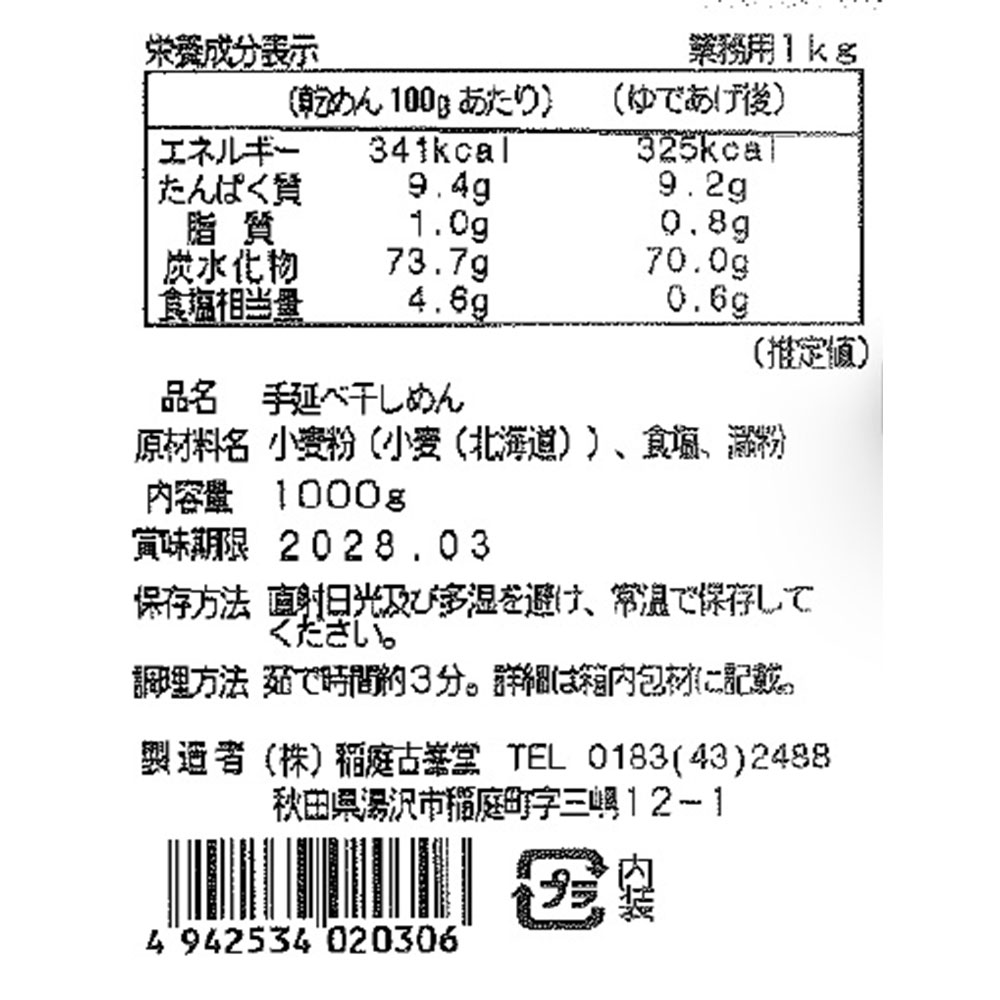 【倉入れ】古峯堂 稲庭うどん 業務用 1kg(ケース入数:20,ロット:1) / 常温 送料無料 うどん 大容量 仕入れ