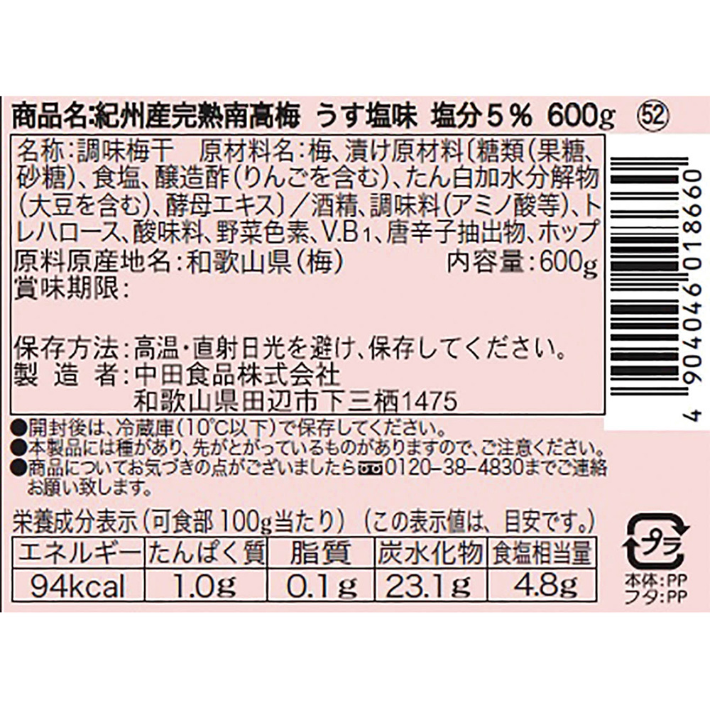 ■規格:紀州産完熟南高梅うす味600g(塩分5%) 【本体、フタ】PP【化粧箱】紙