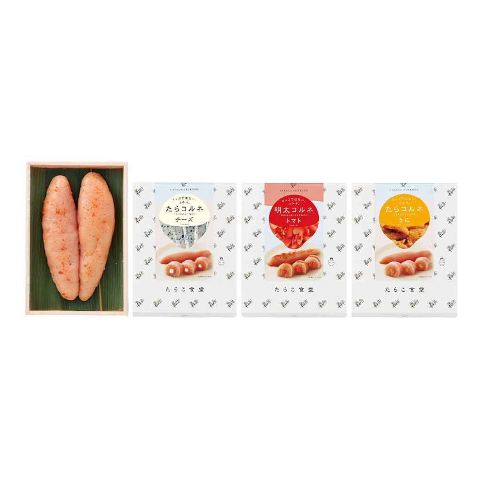 ■規格:辛子明太子(あごだし味)100g、明太コルネ(トマト)100g、たらコルネ(チーズ)100g、たらコルネ(うに)100g