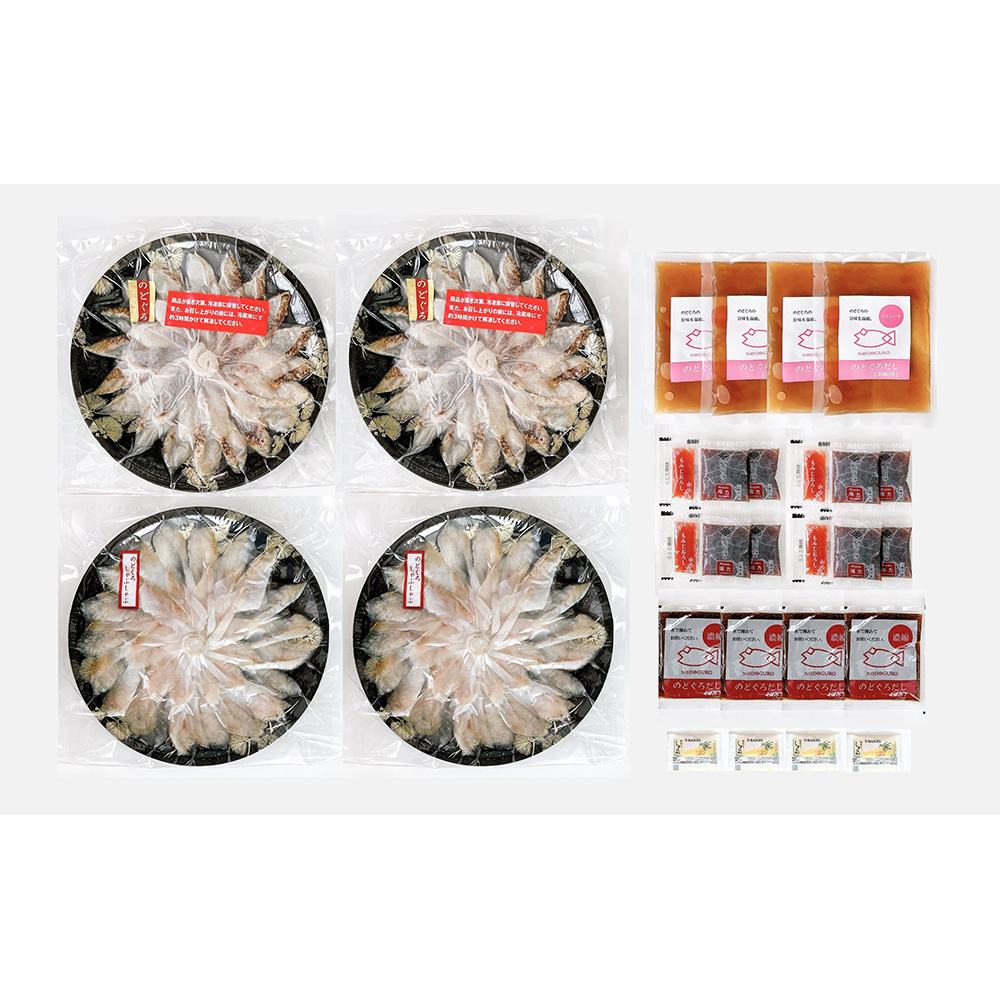 ■規格:のどぐろ炙り刺し120g×2、のどぐろだし(出汁茶漬け用)100g×4、ポン酢14g×8、もみじおろし2.5g×8、のどぐろしゃぶしゃぶ140g×2、のどぐろだし(鍋用)50g×4、おろししょうが2.5g×4
